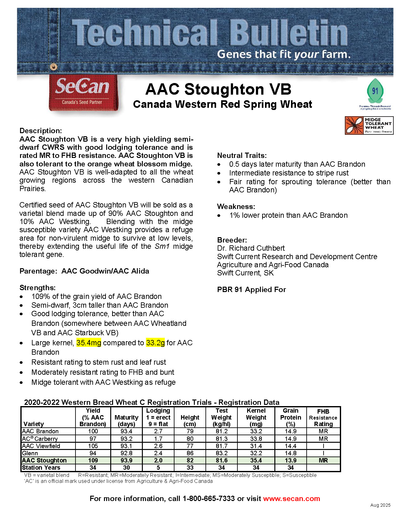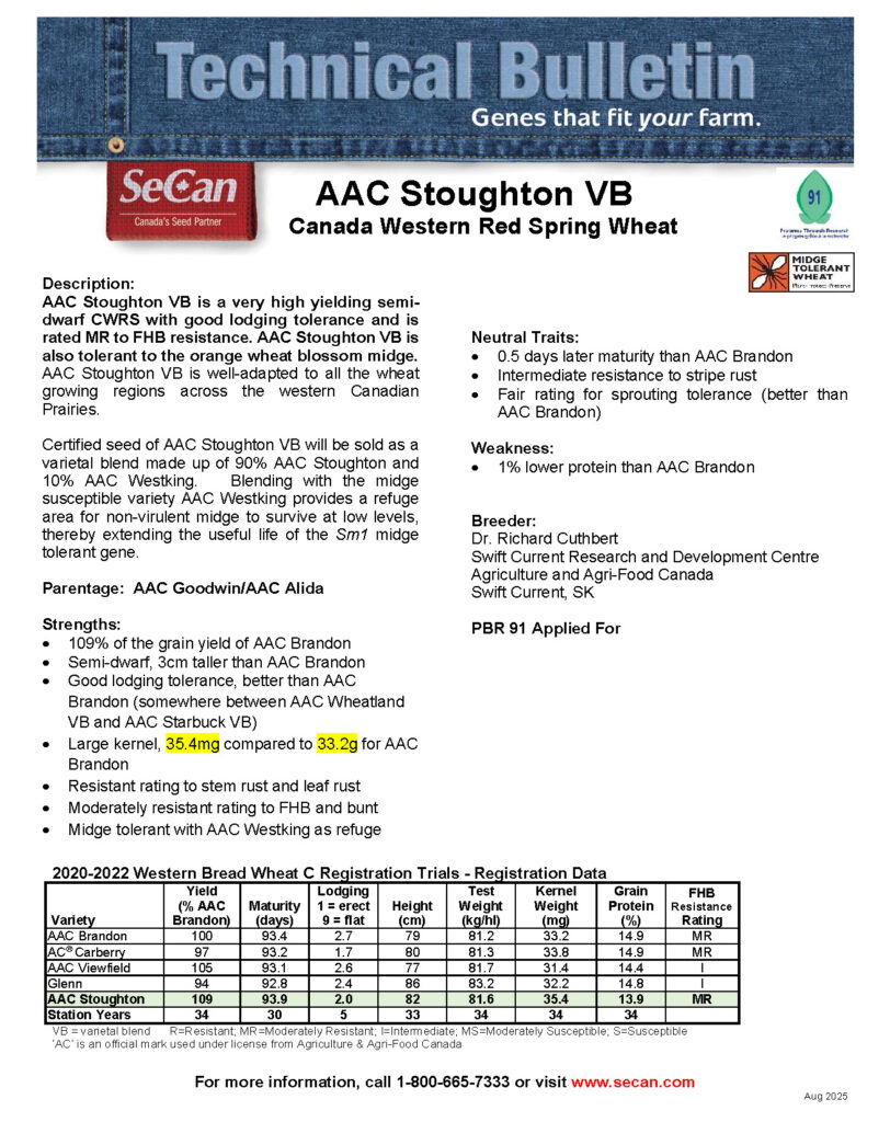 A very high yielding semi-dwarf CWRS with good lodging tolerance and is rated MR to FHB resistance.